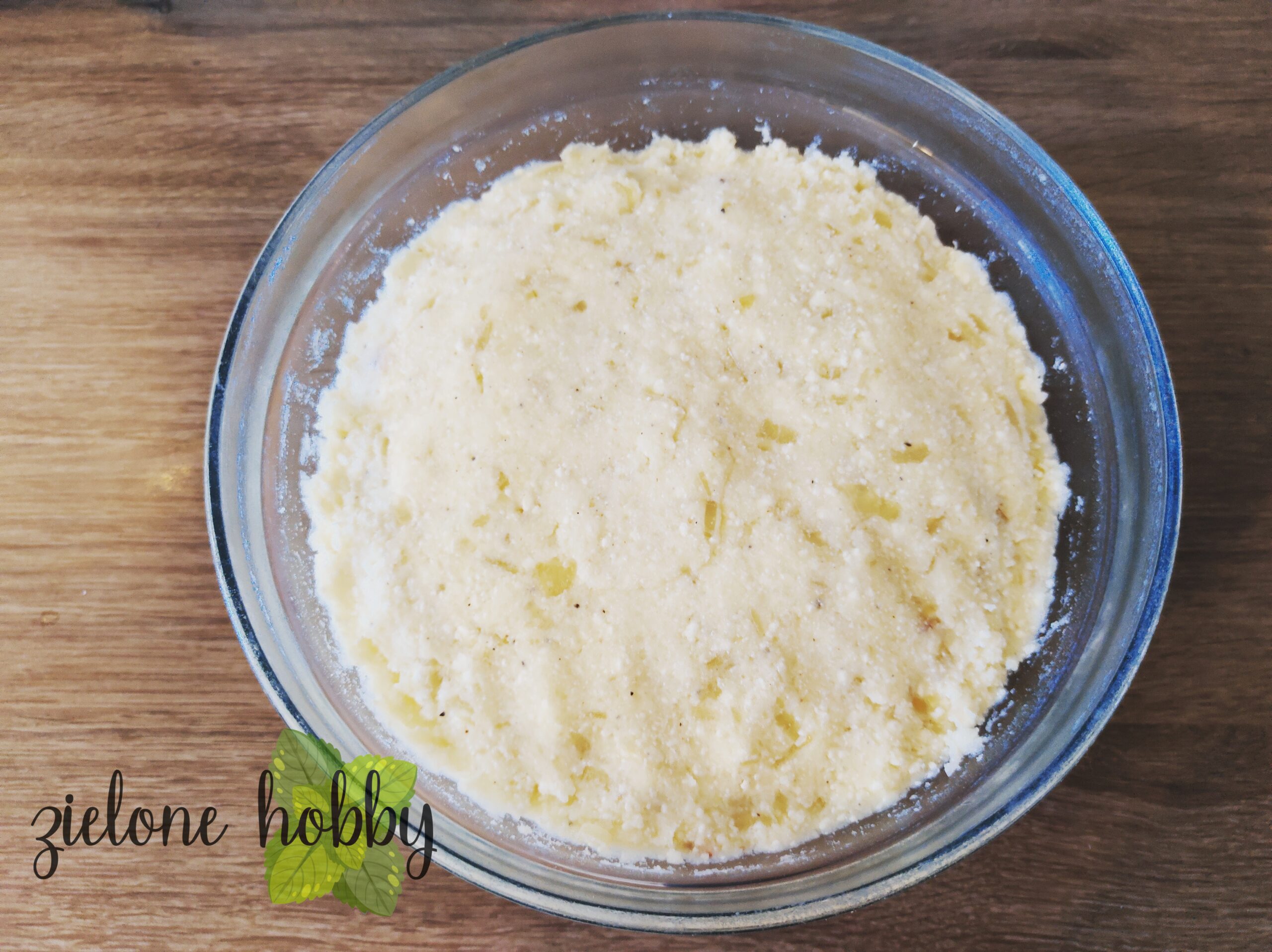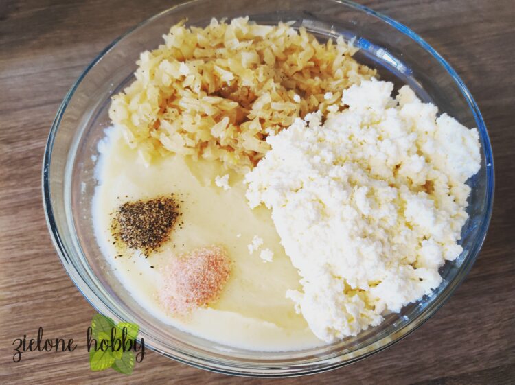 - Dodaj zeszkloną cebulę do ziemniaków, dodaj twaróg, pieprz oraz sól. Opcjonalnie drobno skruszaną, suszoną miętę.