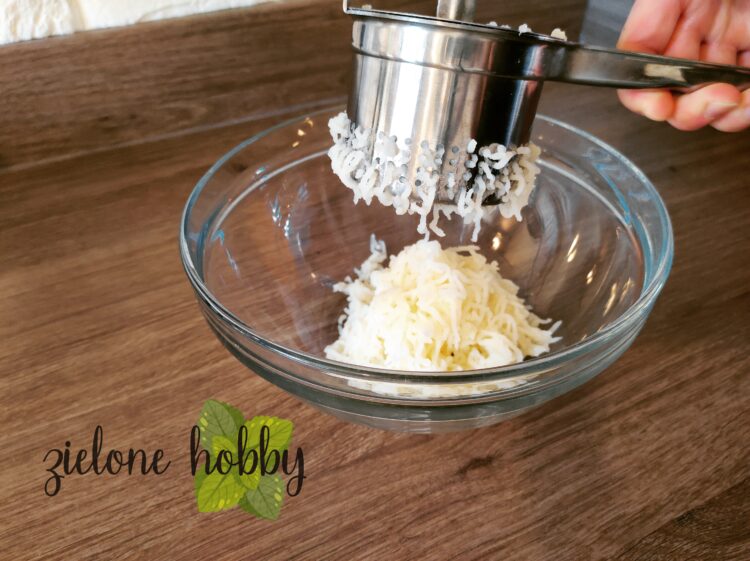 - Ziemniaki należy ugotować i utłuc. Po wystudzeniu (lekko ciepłe) puree przecisnąć przez praskę, by pozbyć się grudek i otrzymać jednolitą masę ziemniaczaną.