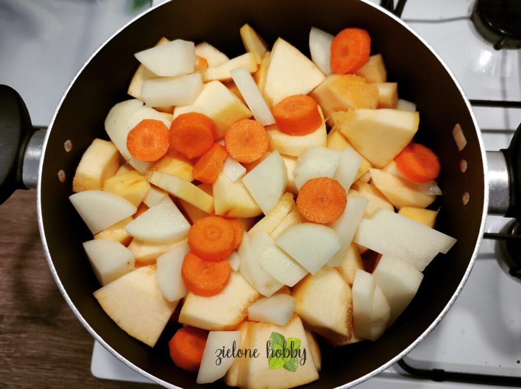 • Całość zalej wodą, tak by jej ilość sięgała do połowy warzyw w garnku. Mieszając, gotuj warzywa do miękkości.